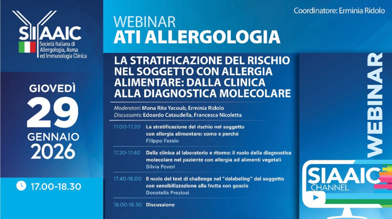 Ti aspettiamo su Siaaic Channel per seguire live il Webinar Ati Allergologia dal titolo "La Stratificazione Del Rischio Nel Soggetto Con Allergia Alimentare: Dalla Clinica Alla Diagnostica Molecolare