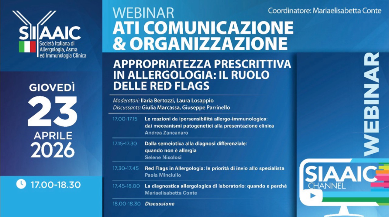 Ti aspettiamo su Siaaic Channel per seguire live il Webinar Ati Comunicazione & Organizzazione dal titolo: "Appropriatezza prescrittiva in allergologia: il ruolo delle red flags” che si terrà il 23 aprile dalle 17:00 alle 18:30