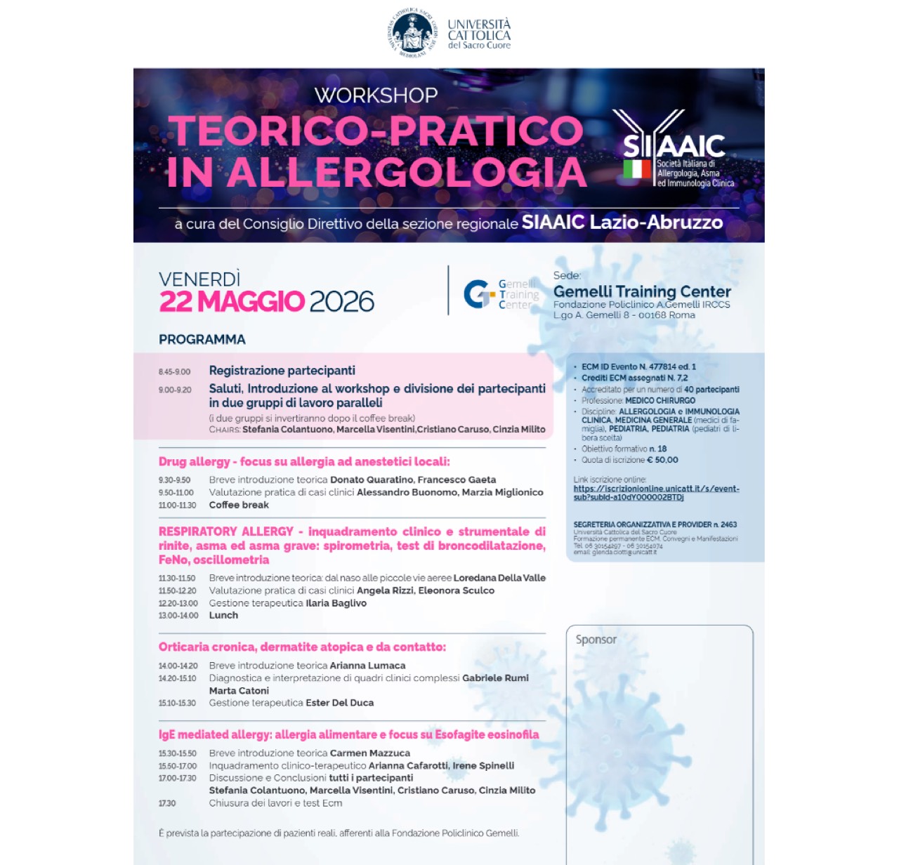 WORKSHOP TEORICO-PRATICO IN ALLERGOLOGIA 22 MAGGIO